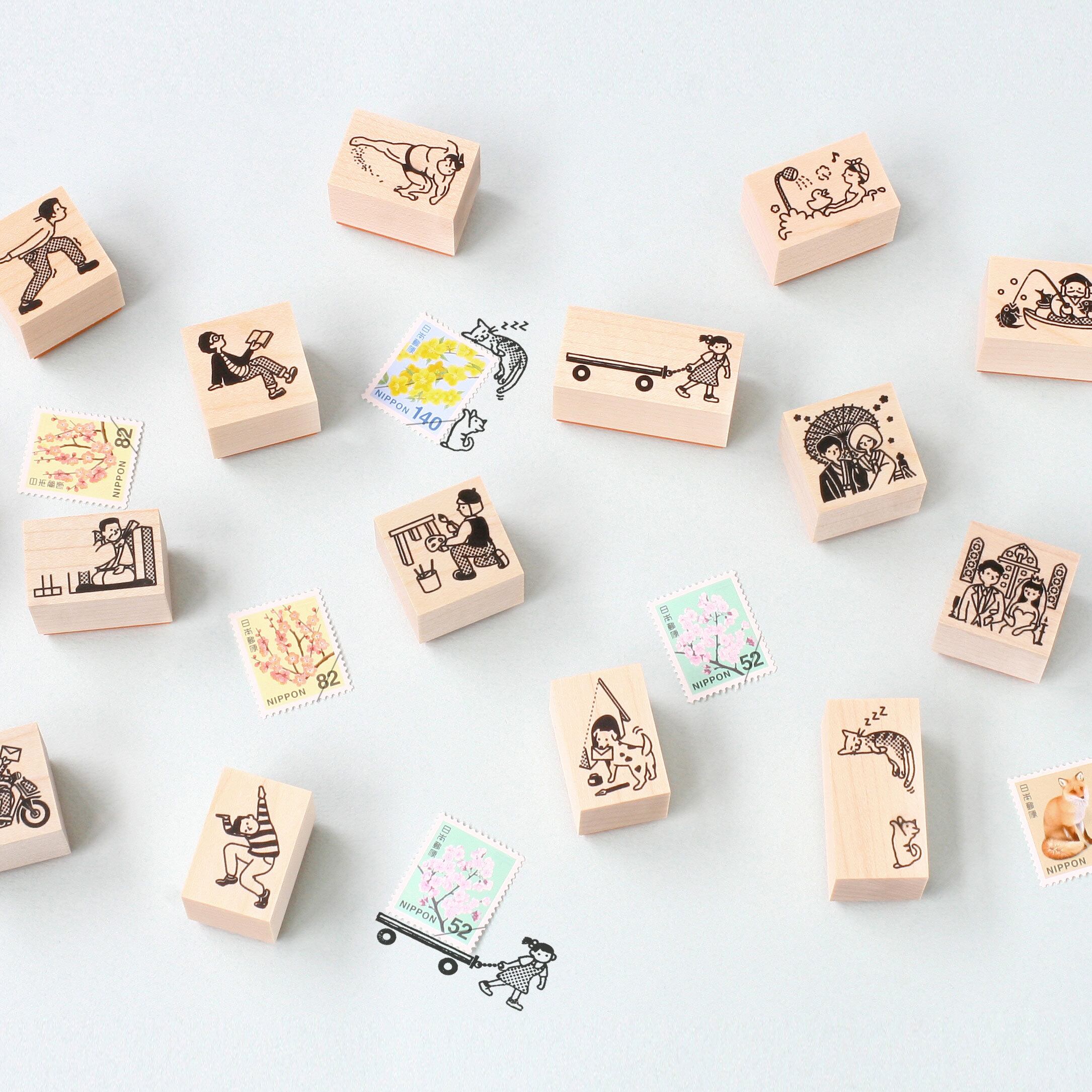 「切手のこびと」は切手と組み合わせて使えるスタンプです。季節の手紙や様々なイベントの招待状、引っ越しの挨拶状、年賀状など、手紙やハガキを送る際に、切手の周りにクスッと笑える物語を沿えて送ることができます。